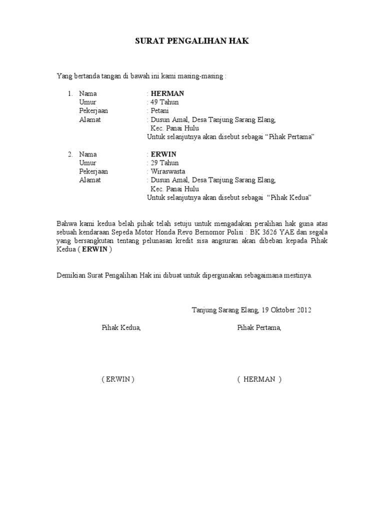 Dengan menggunakan surat kuasa ini maka tidak akan ada keraguan terhadap si penerima kuasa. Surat kuasa biasanya digunakan untuk mengurus berbagai permasalahan administrasi. Jika motor baru berarti itu adalah bpkb yang pertama atau baru, sedang jika bekas maka perlu pindah nama kepemilikan dahulu. Contoh surat kuasa pengurusan balik nama bpkb dan ganti nopol. Dengan ini pemberi kuasa memberikan kuasa, berupa : Contoh surat kuasa pengambilan bpkb. Pos rt 003/001 bojonggede memberikan kuasa kepada : Buku pemilik kendaraan bermotor (bpkb) merupakan buku yang diterbitkan oleh kepolisian yang digunakan sebagai tanda bukti kepemilikan kendaraan bermotor. Ketentuan mengenai surat kuasa sudah diatur dalam tujuan dari surat kuasa ini tentu saja untuk melimpahkan kewenangan dari si pemberi kuasa ke sebagai tanda kepemilikan dari sebuah kendaraan, sehingga patut untuk disimpan dengan baik. Adanya surat ini memberikan keuntungan bagi perusahaan karena melepaskan seluruh tanggung jawab atas penggunaan dan kepemilikan aset. Berikutnya, pemberi kuasa dan penerima. Kali ini kita akan membahas mengenai keterangankepemilikan yang isinya menerangkan bahwa seseorang memang benar memiliki kendaraan tertentu. Apabila melebihi tanggal yang disebutkan, maka kepemilikan kendaraan secara otomatis berada di pt.